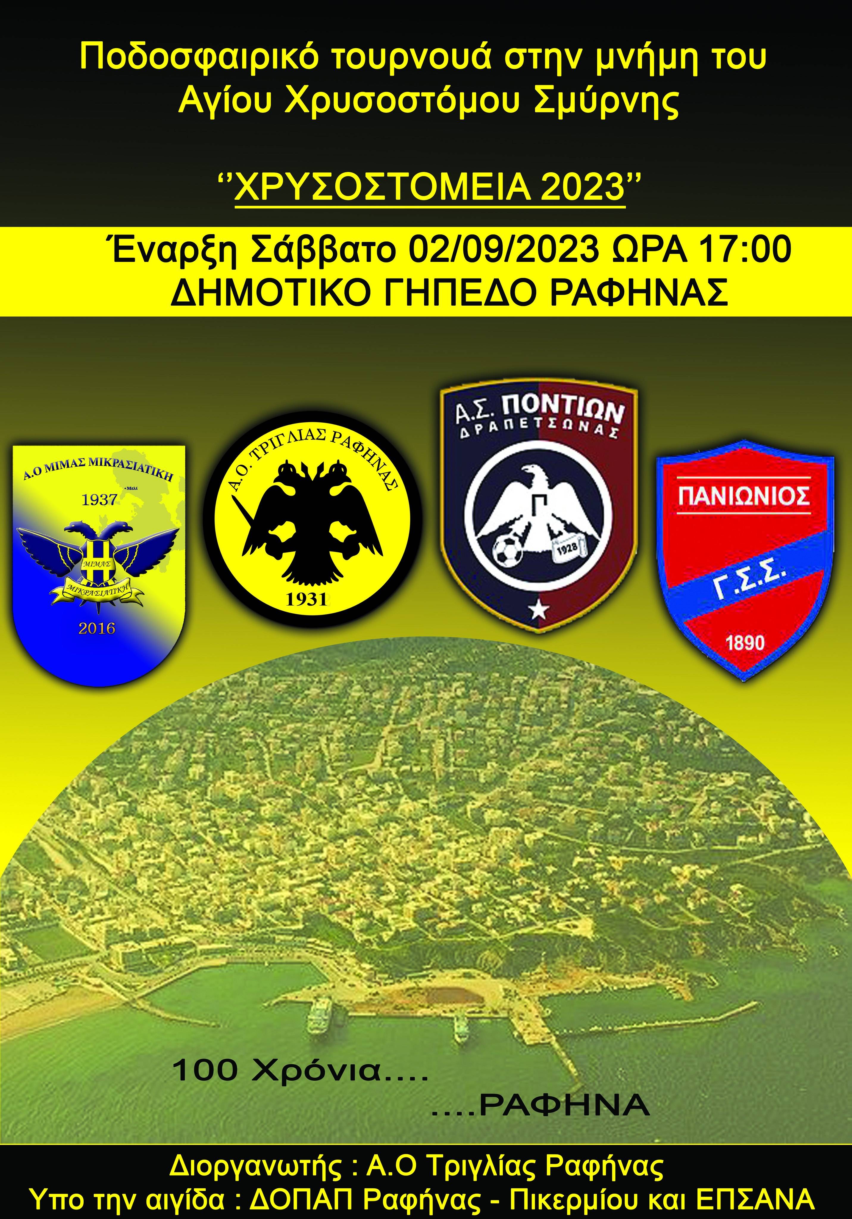 Ο Α.Ο. Τριγλίας Ραφήνας τιμώντας την ιστορία του, τις καταβολές του και τον Άγιο των Μικρασιατών Εθνομάρτυρα και Ιερομάρτυρα Χρυσόστομο Σμύρνης διοργανώνει και φέτος το ποδοσφαιρικό τουρνουά ΧΡΥΣΟΣΤΟΜΕΙΑ 2023.