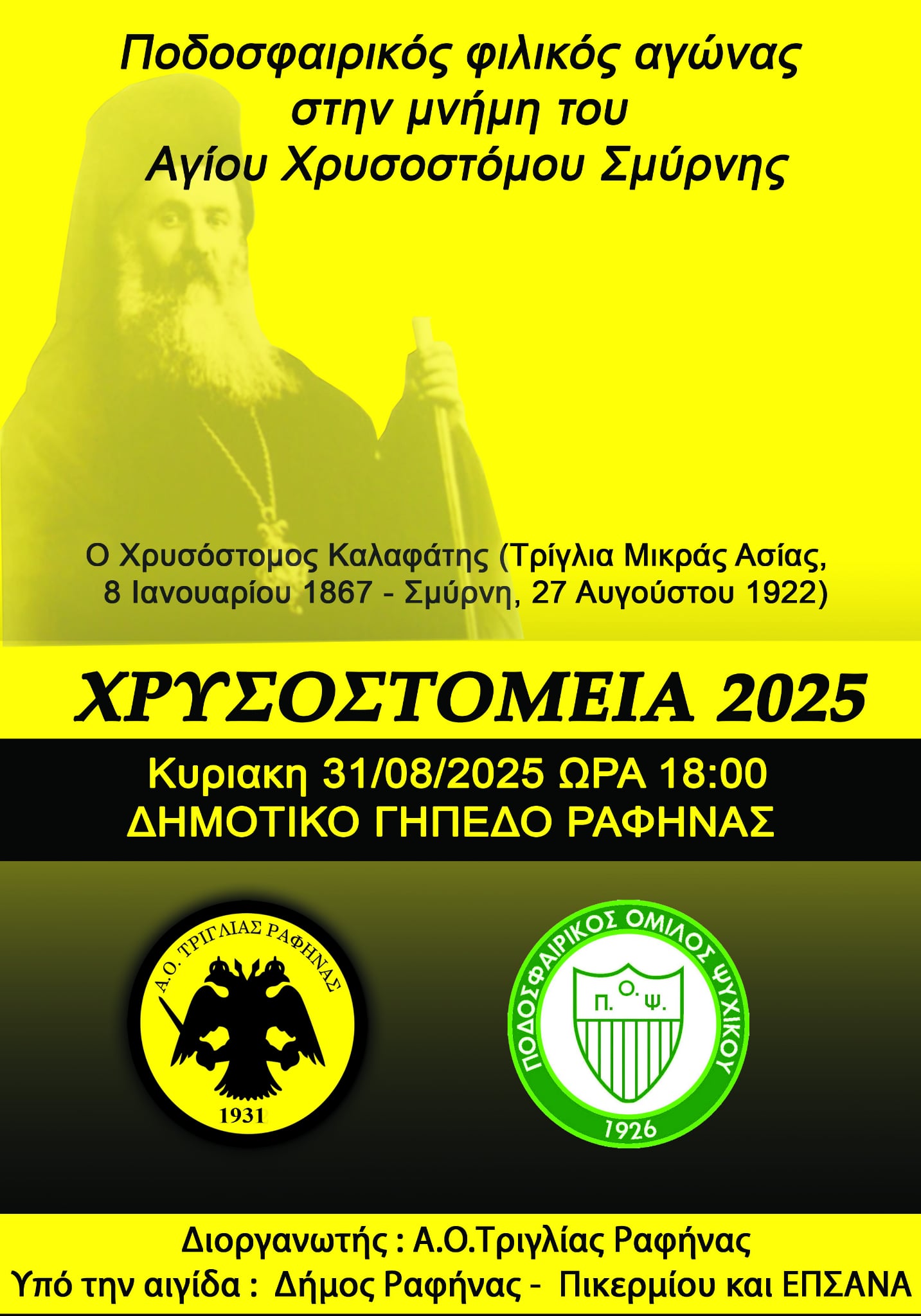 Ο Α.Ο. Τριγλίας Ραφήνας, πιστός στην καταγωγή του και θέλοντας να τιμήσει τον Τριγλιανό Άγιο των Προσφύγων, Εθνομάρτυρα και Ιερομάρτυρα Χρυσόστομο Σμύρνης, διοργανώνει ποδοσφαιρικό αγώνα την Κυριακή 31 Αυγούστου, στο Δημοτικό Γήπεδο Ραφήνας, με αντίπαλο το προσφυγικό σωματείο του Π.Ο. Ψυχικού.