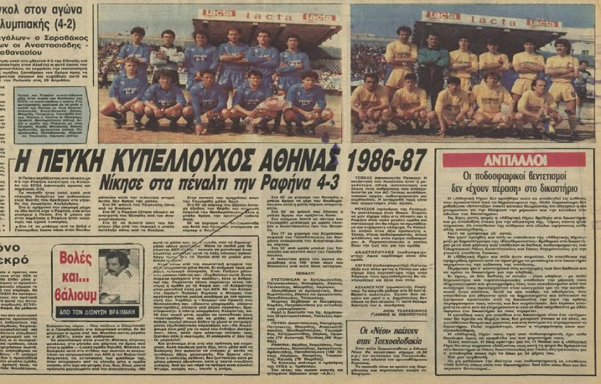 Σαν σήμερα πριν 33 χρόνια και πιο συγκεκριμένα στις 15 Απριλίου 1987, ο Α.Ο. Τριγλίας Ραφήνας αντιμετώπισε στο γήπεδο Λεωφόρου Αλεξάνδρας τον Α.Ο. Πεύκης, στον τελικό κυπέλλου ΕΠΣ Αθηνών.