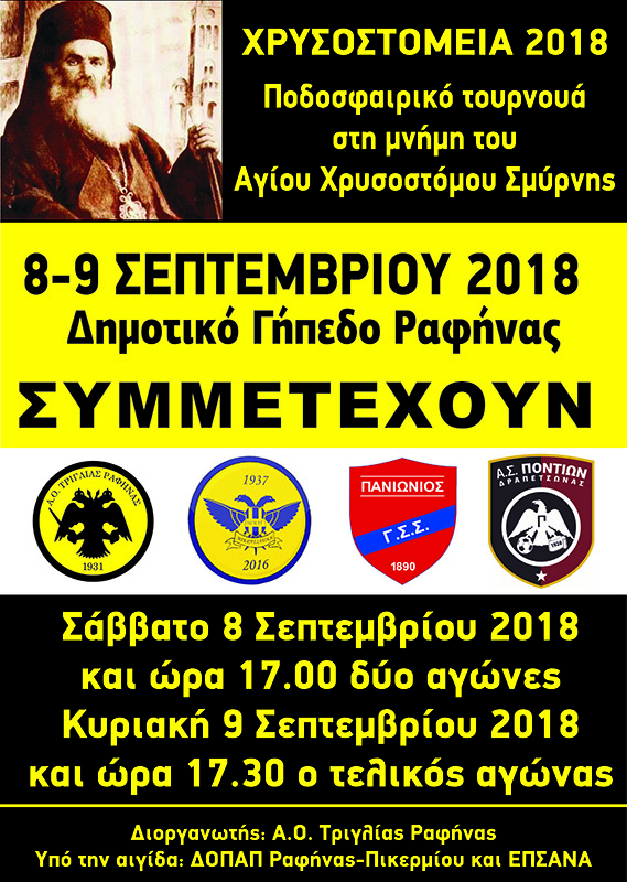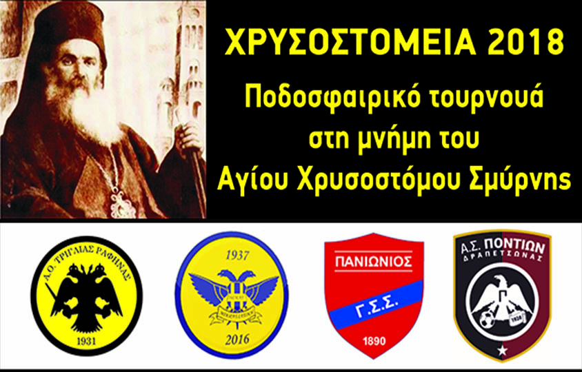 Την Πέμπτη 30 Αυγούστου πραγματοποιήθηκε η κλήρωση του 6ου προσφυγικού τουρνουά "ΧΡΥΣΟΣΤΟΜΕΙΑ 2018" στα γραφε'ια του Α.Ο. Τριγλίας Ραφήνας, παρουσία των εκπροσώπων των ομάδων που συμμετέχουν και της δημοτικής αρχής που εκπροσωπηθηκε από τον πρώην Δήμαρχο και νυν Γεν. Γραμματέα του Δήμου μας κ. Πιστικίδη και του Αντιδημάρχου κ. Παλπατζή.